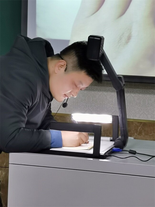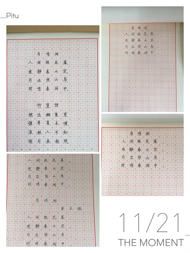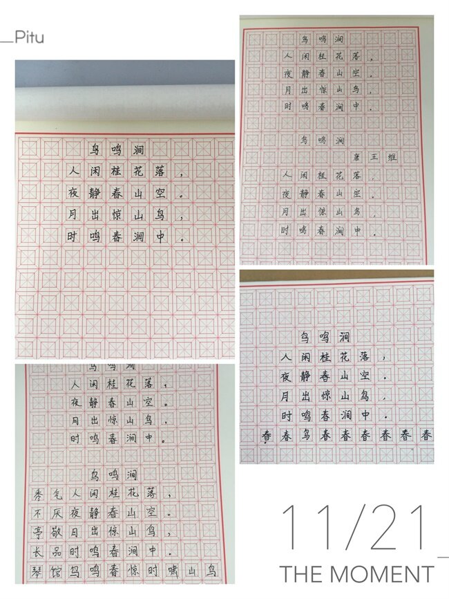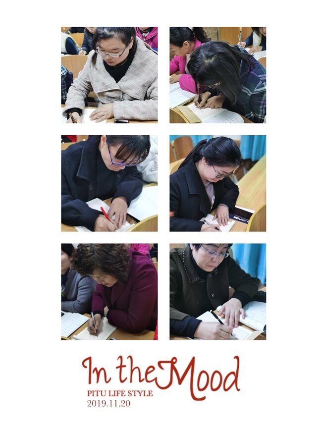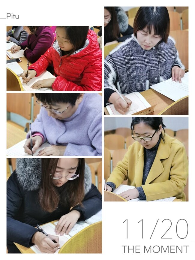 武老师讲述完硬笔书法的基础知识后,为教师们现场展示了他的硬笔书法,他书写的是王维的《鸟鸣涧》这首诗,武老师的字行云流水,文笔流畅,一手好字真叫人拍案叫绝,这极大激起了教师们要练字的兴趣,教师们个个在认真地临摹这首诗,无论老中青,每个老师书写的都很认真!
